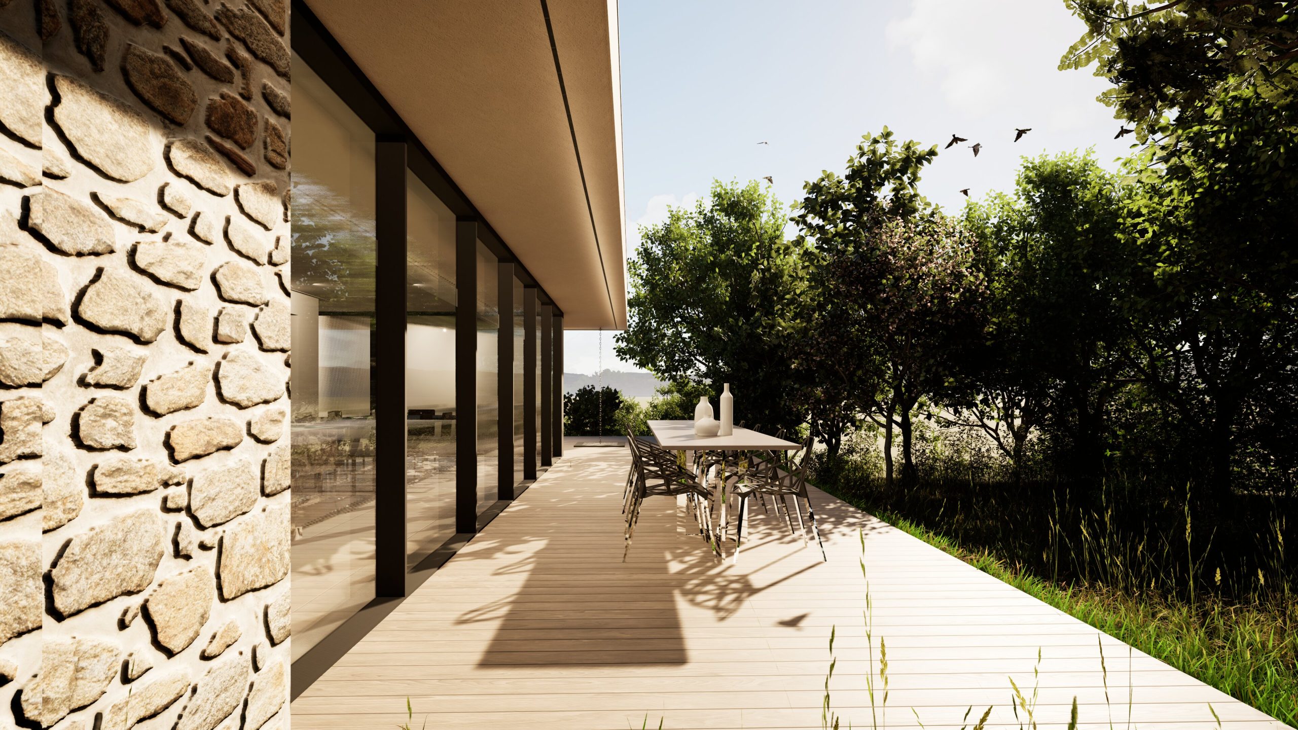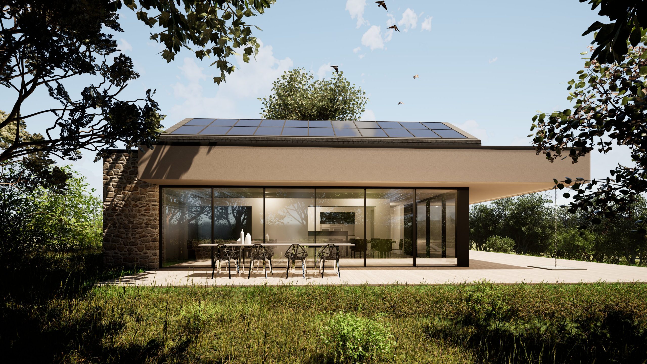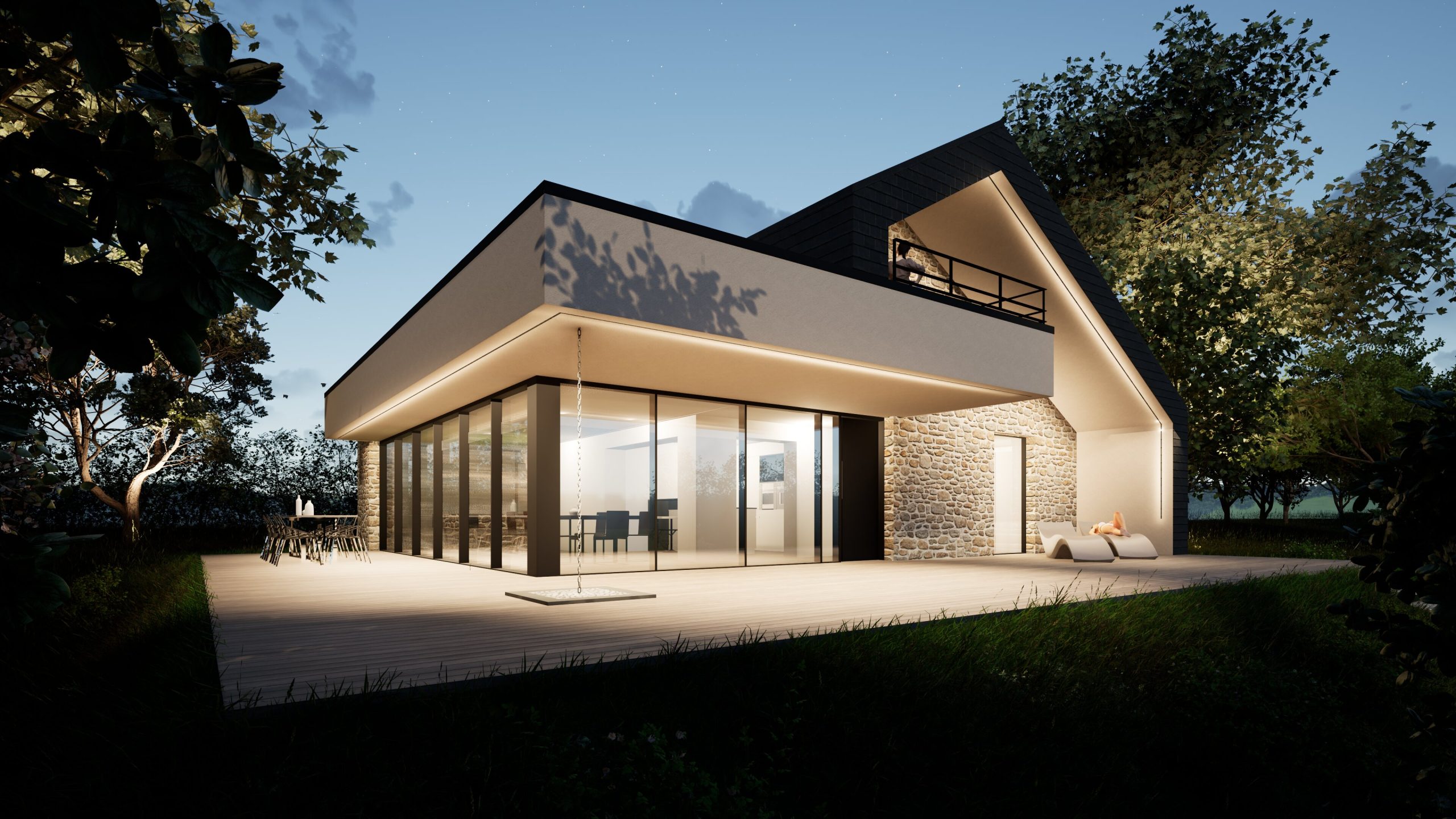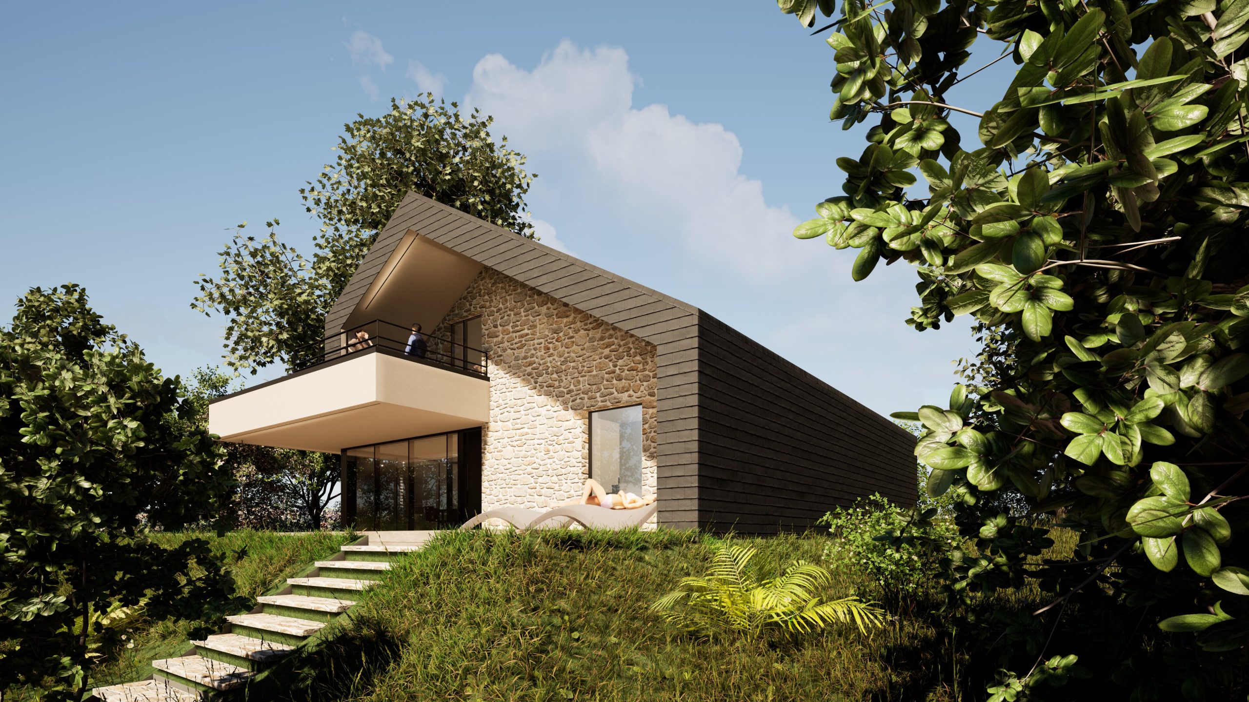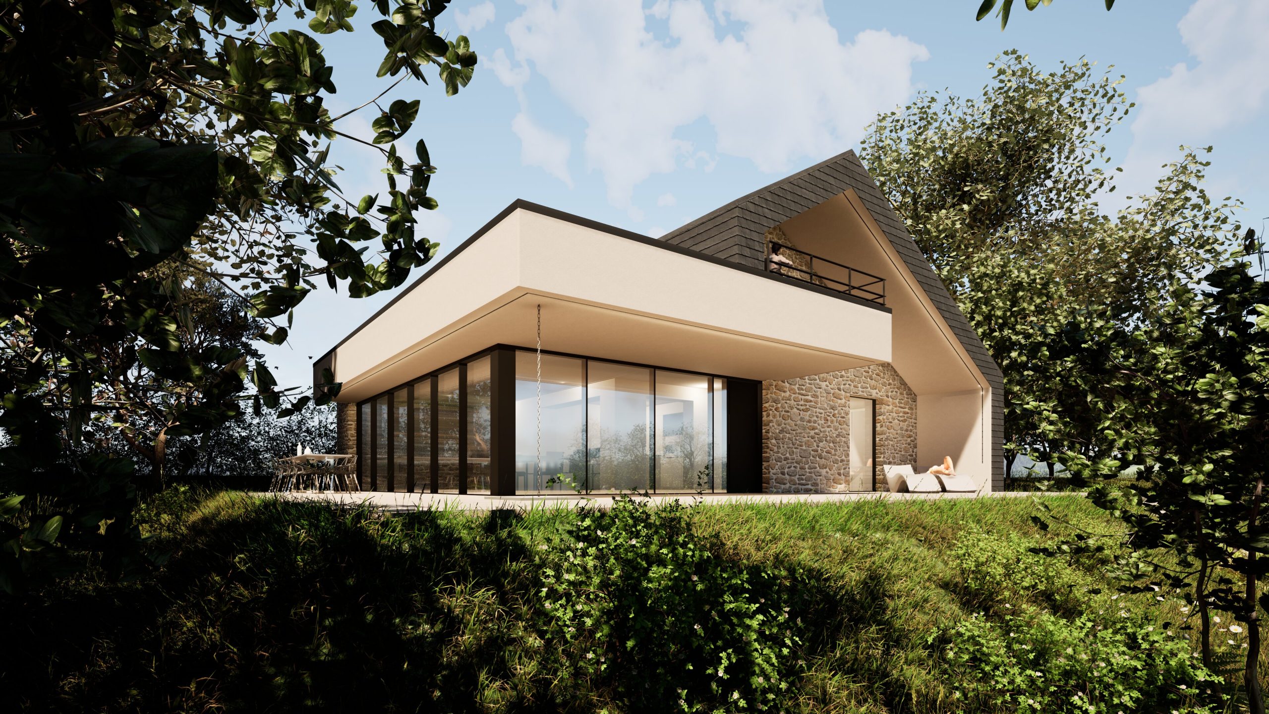 Construit en pierre naturelle de la région et coiffé d’une toiture en ardoise naturelle, le bâtiment s’ancre avec élégance dans son cadre boisé. L’harmonie entre tradition et modernité se retrouve dans les lignes épurées du projet, qui offrent un confort contemporain tout en valorisant le patrimoine local.