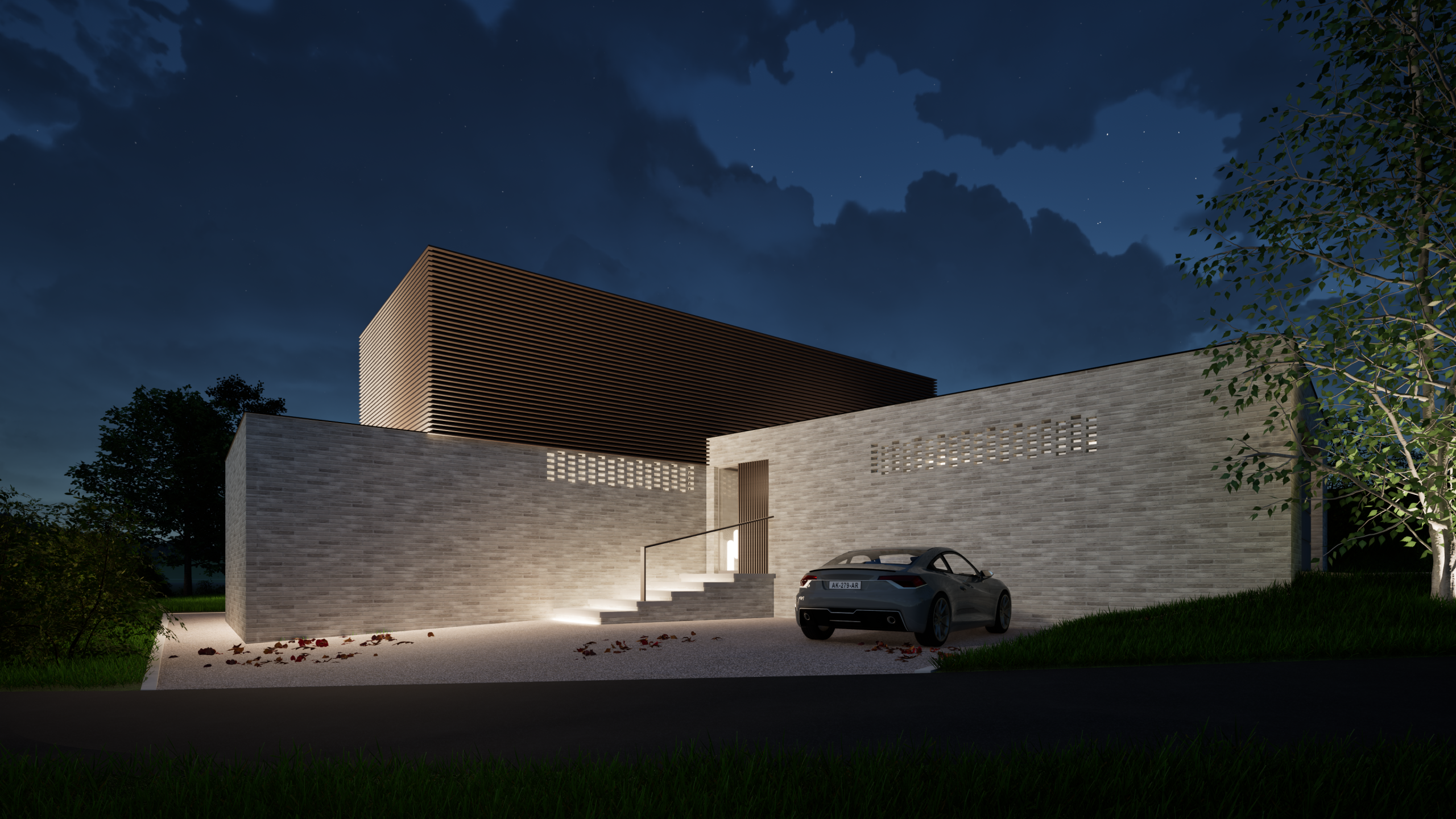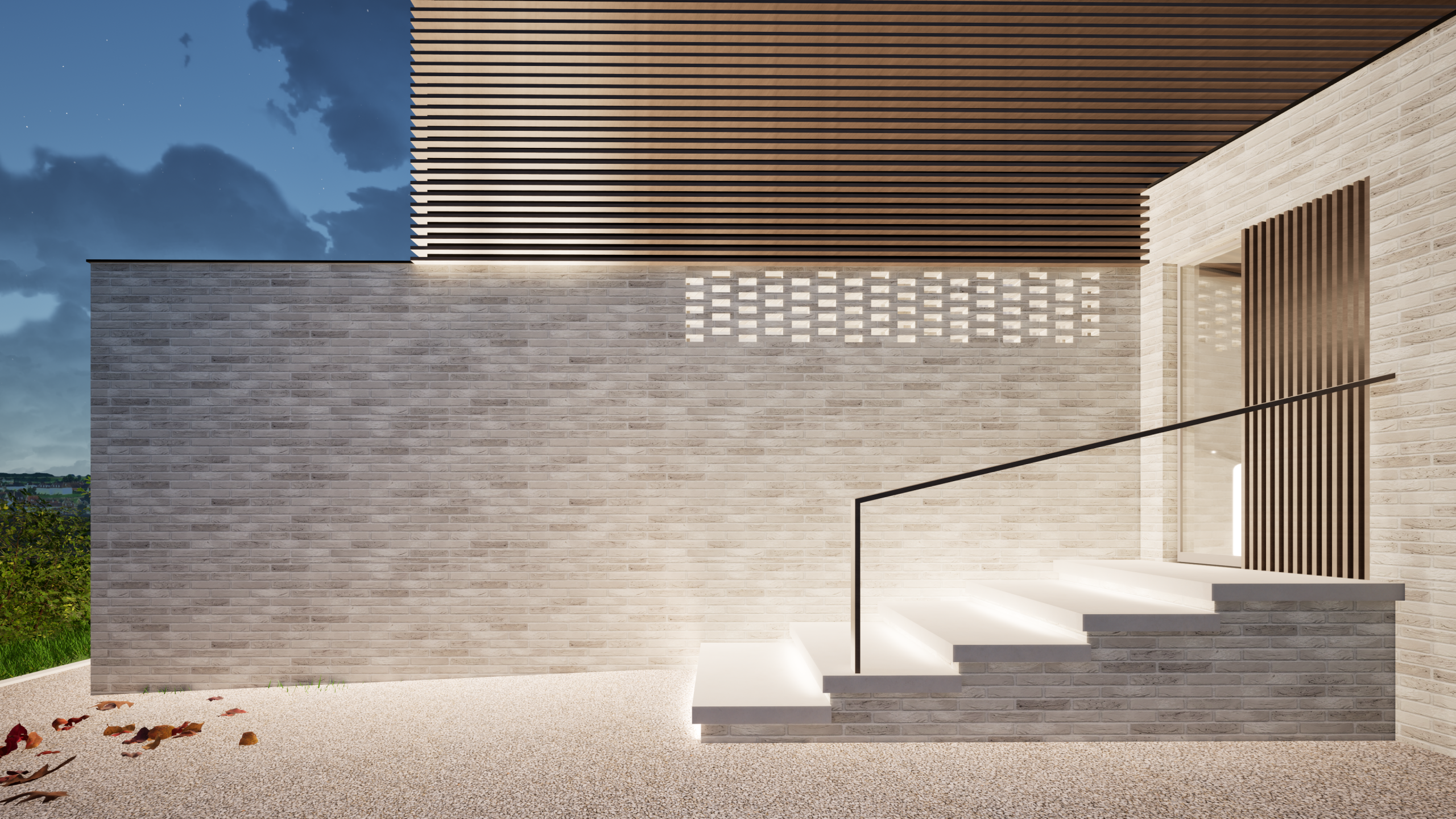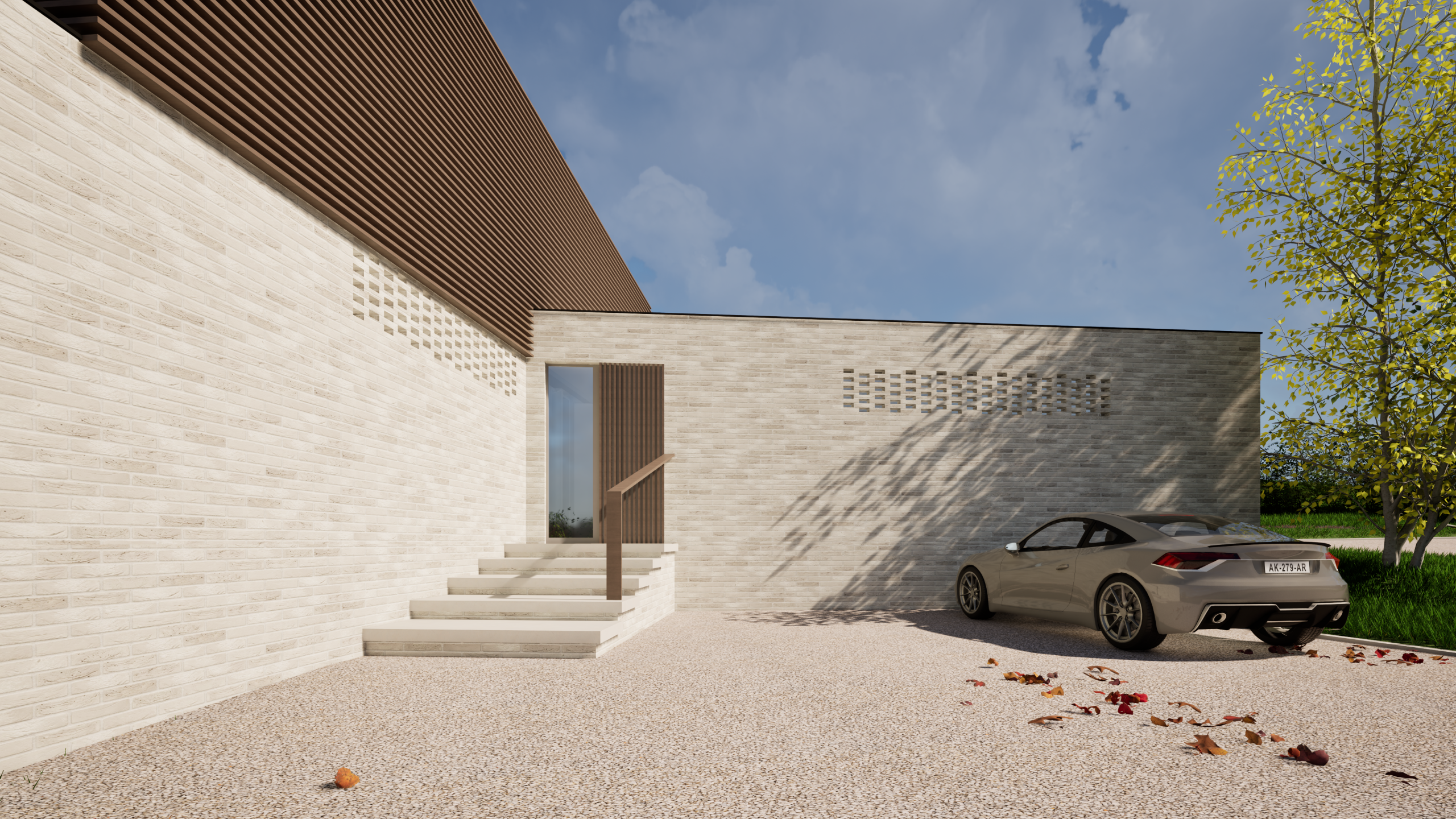 Le rez-de-chaussée, habillé de brique blanche, affirme une base solide et lumineuse, tandis que l’étage en bardage bois apporte chaleur et contraste à l’ensemble. Cette composition de matières met en valeur la sobriété des lignes et l’équilibre des proportions.