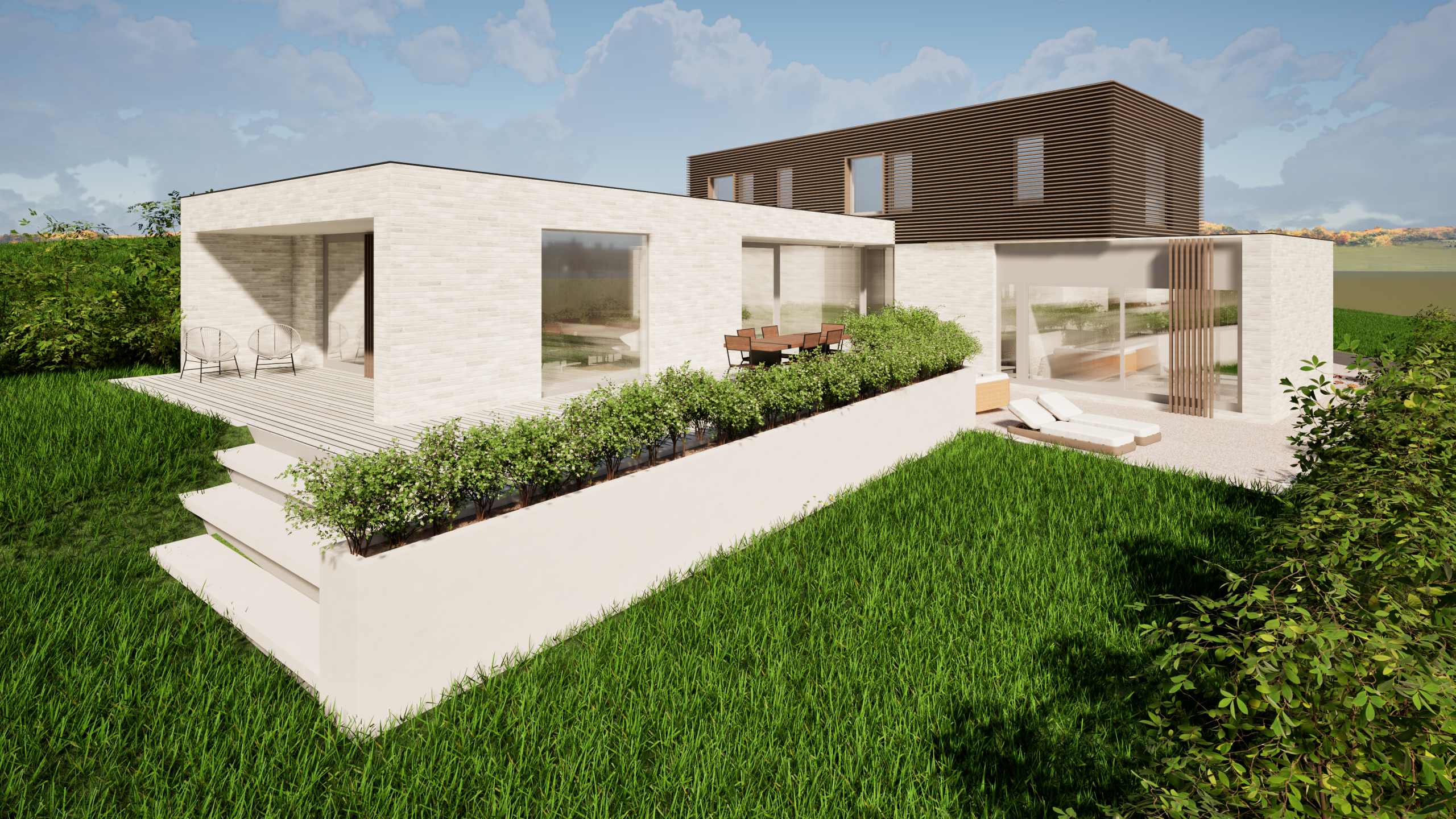 Implantée sur un terrain légèrement en pente, cette maison unifamiliale s’inscrit avec finesse dans la topographie existante. Sa volumétrie suit naturellement le relief, créant une implantation fluide qui valorise les vues dégagées vers le jardin arrière.
